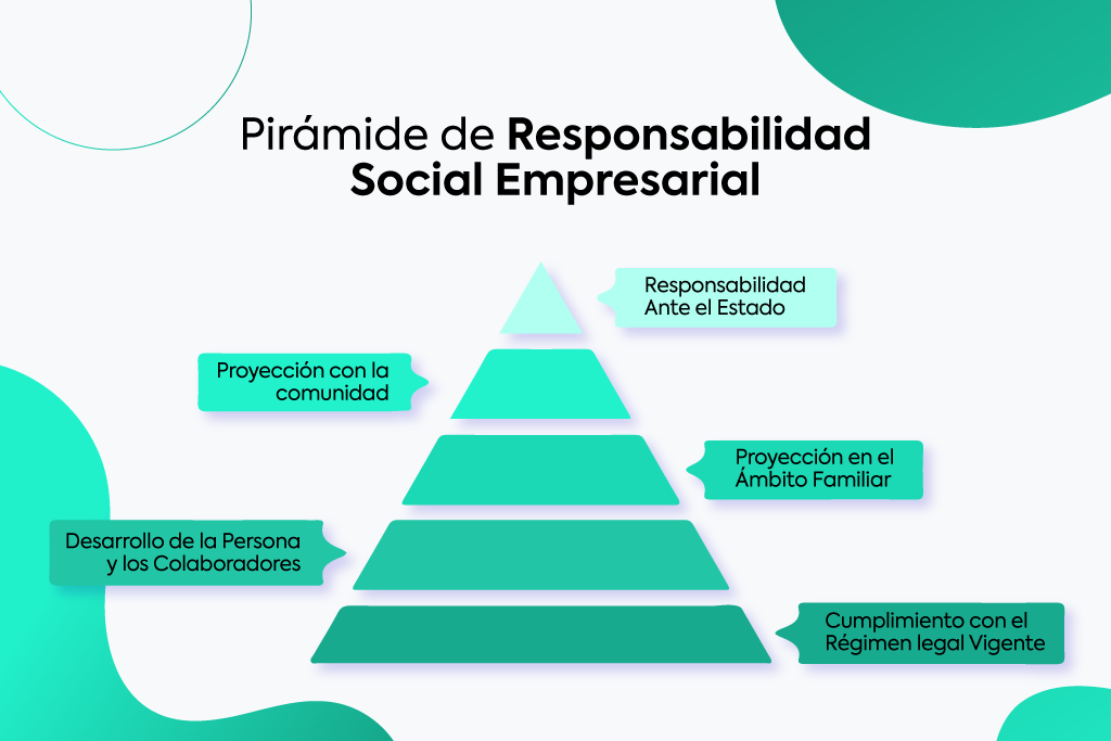 La Pirámide de Responsabilidad Empresarial coloca el cumplimiento del marco legal como el primer paso para el desarrollo de acciones o prácticas RSE en tu empresa, el paso siguiente será enfocarse en las Condiciones Laborales y de Oportunidades para los colaboradores, para así continuar con la Proyección del Ámbito Familiar que refiere a los beneficios que la empresa ofrece para los colaboradores y sus familias; luego nos encontraremos con la Proyección a la Comunidad que se enfoca en las alianzas con relaciones publicas para el beneficio local en común y por último, nos encontraremos con la Responsabilidad ante el Estado, que se refiere a la participación de la empresa en la agenda social y ambiental del país.
