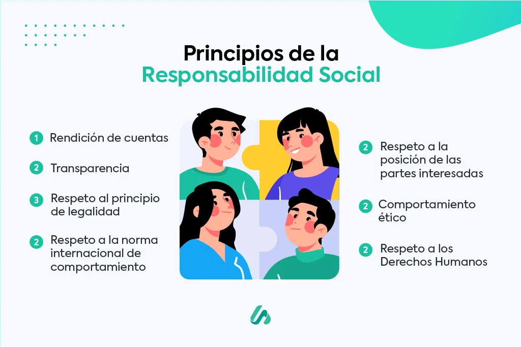 Los principios de la RSE contemplados en la Norma: rendición de cuentas, transparencia, comportamiento ético, respeto a los intereses de las partes interesadas, respeto al principio de legalidad, respeto a la normativa internacional de comportamiento y respeto a los derechos humanos.