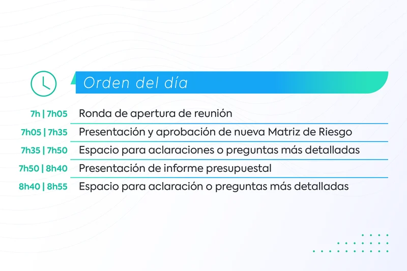 Para garantizarlo, recuerda el tiempo destinado de duración a quien sea responsable de presentar la información o reporte, esto para evitar exceso de tiempo o detalles innecesarios y garantizar que cada persona sea objetiva y clara, considerando que debe aprovechar bien su tiempo.