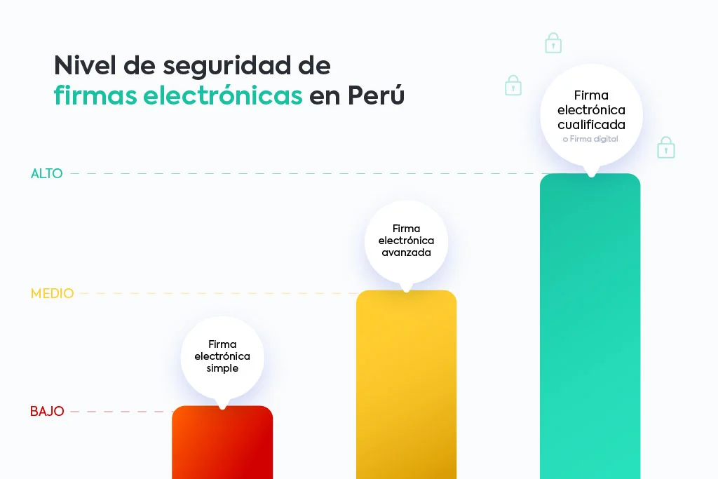 Los tres tipos de firma electrónica reconocidos por el estado peruano poseen diferencias en relación con los niveles de seguridad que entregan y el respaldo legal que poseen según su capacidad de asegurar la identidad del firmante.