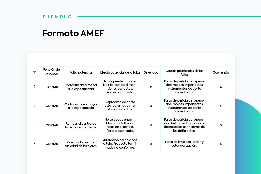Análisis del Modo y Efecto de Fallas (AMEF), consiste en un análisis para identificar, clasificar y eliminar anticipadamente las fallas de un proyecto empresarial.