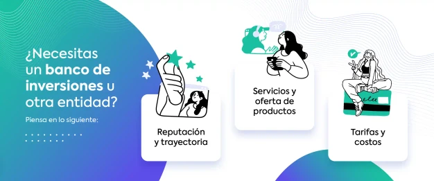 Recuerda que los bancos de inversiones están especializados en una cartera de grandes clientes, por lo que debes tomar en cuenta si tus necesidades de financiamiento ameritan las soluciones que este tipo de entidades ofrecen. También piensa en que hay bancos que ofrecen créditos empresariales con altas tasas de interés por no tratarse de su servicio principal. Comparar las tarifas asociadas a los diferentes servicios que ofrecen las entidades financieras podría ser el punto determinante para saber si la opción ideal para ti es un banco de inversión, un banco comercial o alguna otra institución financiera.