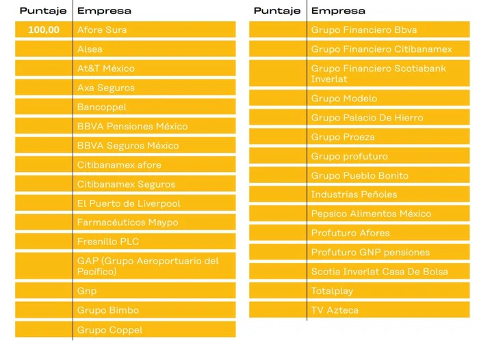 A continuación, presentamos una tabla con las empresas que obtuvieron la puntuación máxima de 100 puntos en Integridad Corporativa 500.